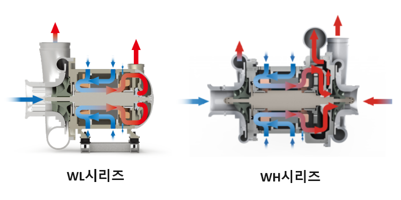 특허 등록된 이중 공기 냉각 시스템(Dual Air-Cooling System)으로 다른 회사에 비해 모터 온도를 10℃ 낮출 수 있습니다. 이 독창적인 기술은 스테이터의 외부를 1차 냉각한 후, 에어포일 베어링, 와인딩, 로터를 2차 냉각하는 방식입니다. 뛰어난 냉각 성능을 발휘하여 별도의 냉각 장치(외부 냉각 팬이나 SINUS 필터 등)를 설치할 필요가 없습니다. 모터와 인버터만으로 시스템을 구성하고 있으며, 터보 기술까지 결합되어 세계 최고의 효율성과 내구성을 구현합니다. 아래 이미지는 싱글 임펠러가 적용된 경우의 냉각 경로를 보여줍니다.